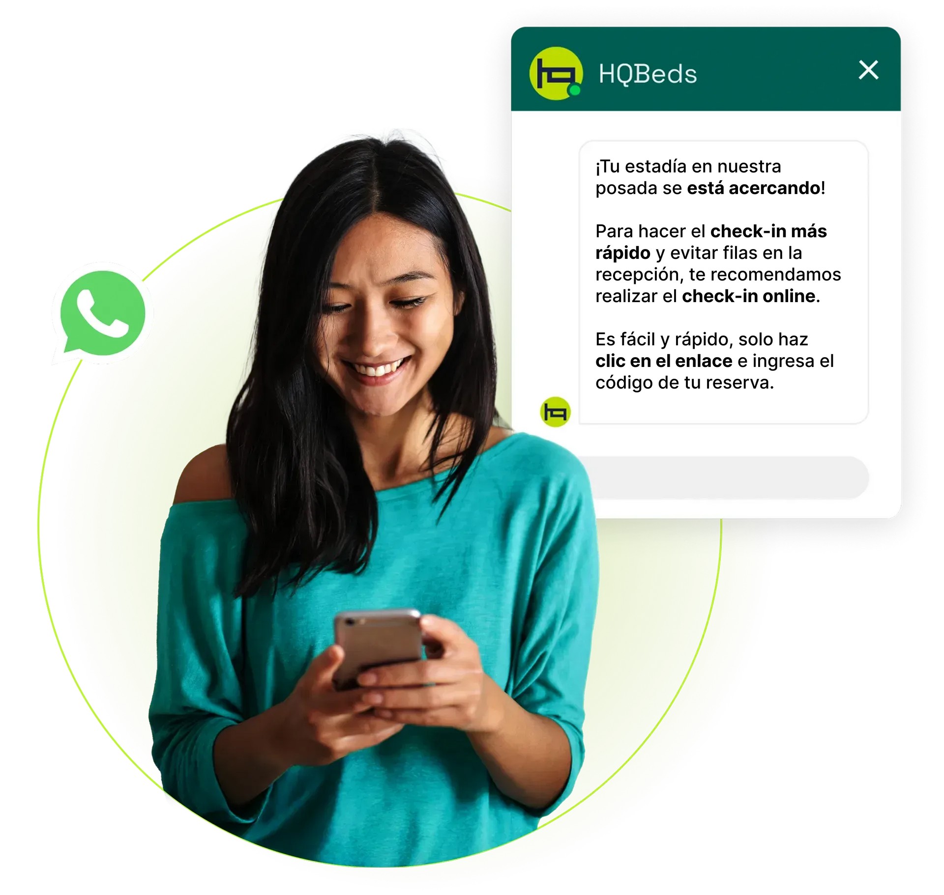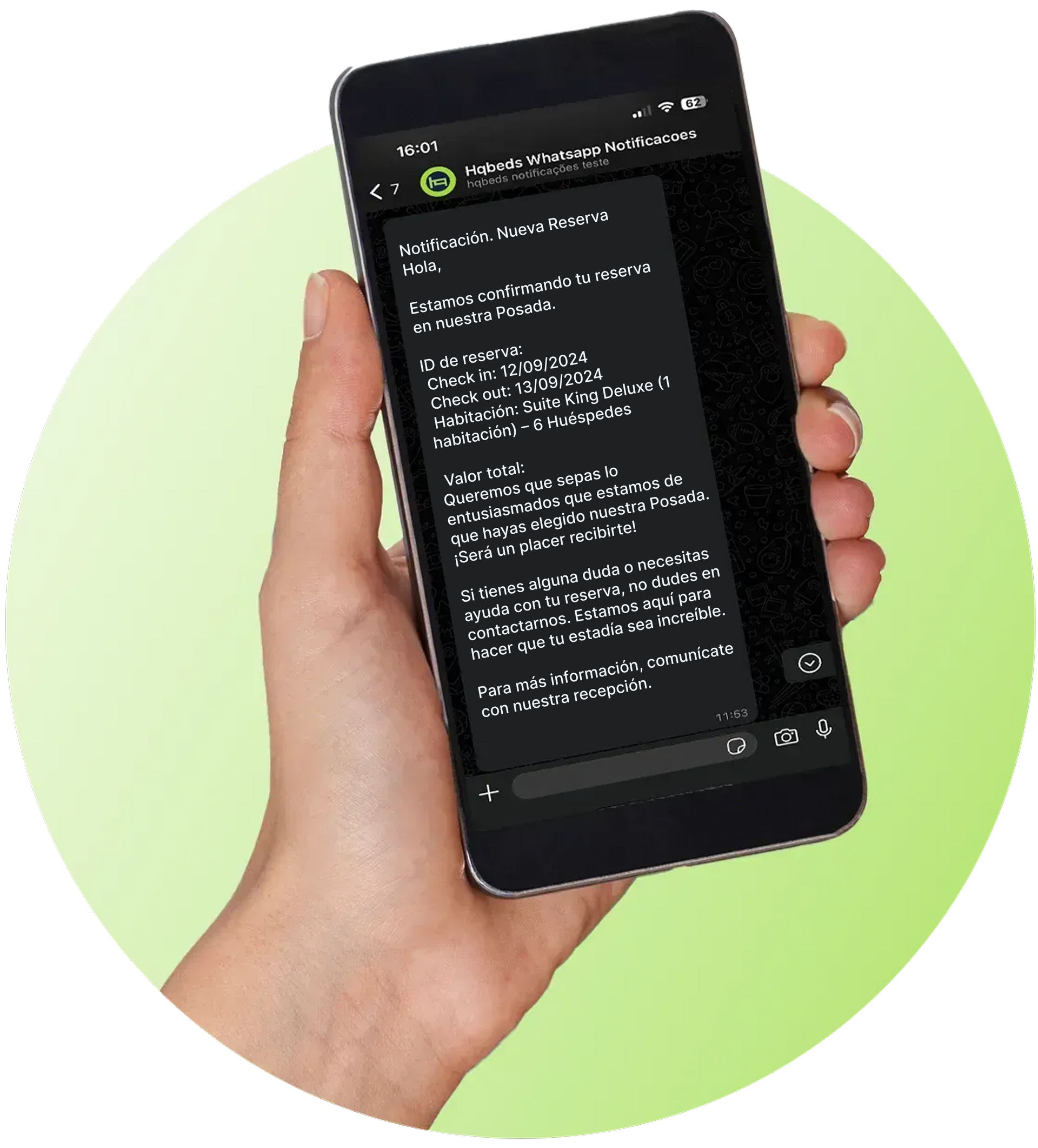 Facilita la comunicación, reduciendo dudas y mejorando la experiencia general del cliente. Cada huésped recibirá mensajes personalizados directamente en WhatsApp, manteniéndolos informados sobre los próximos pasos de su estadía.